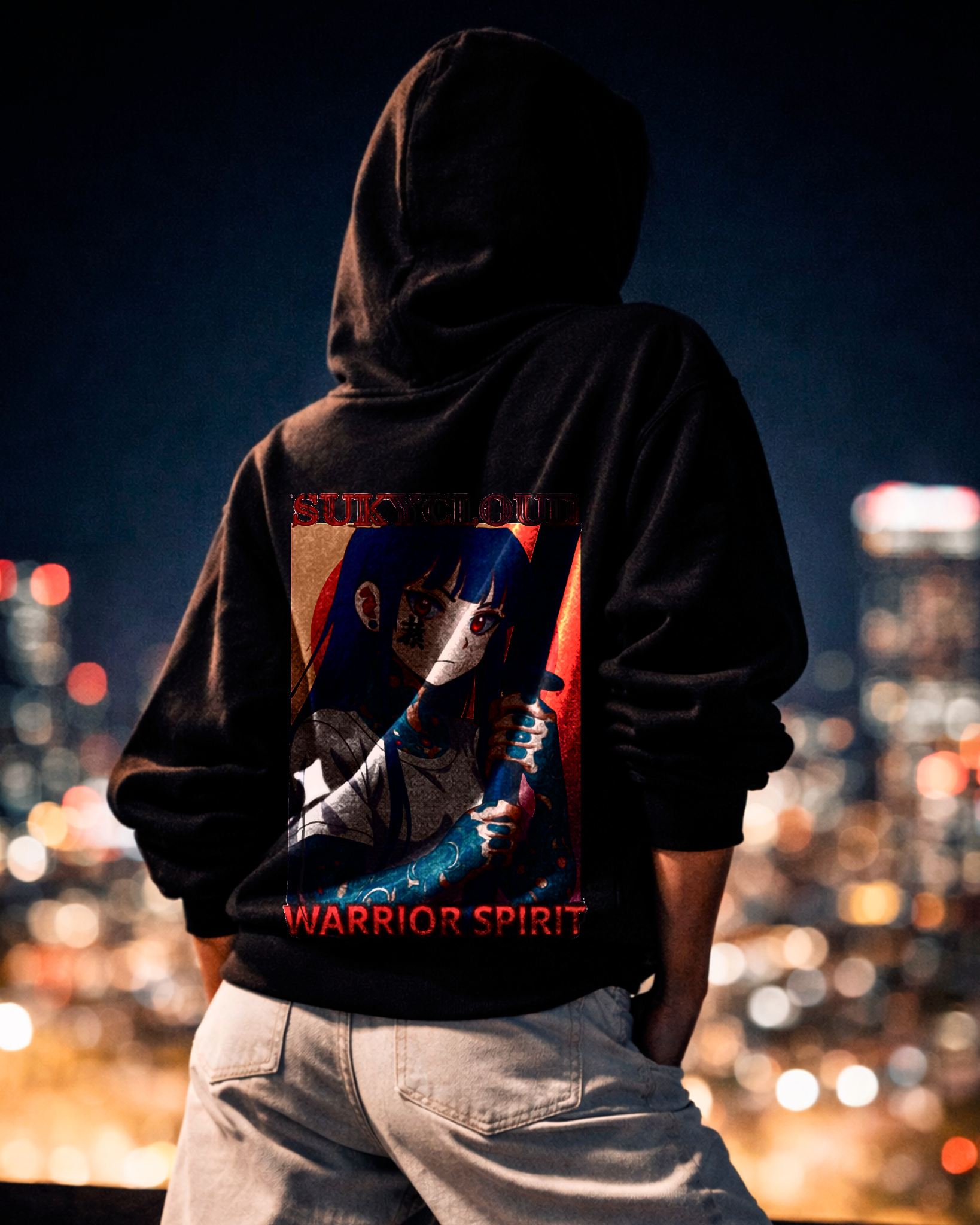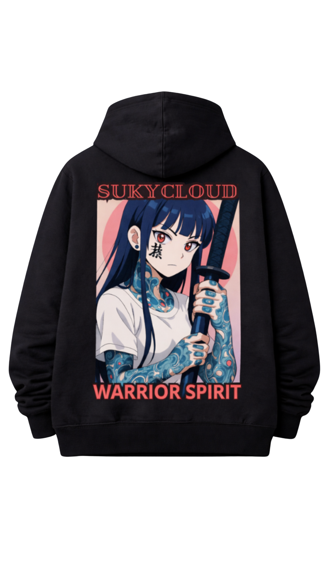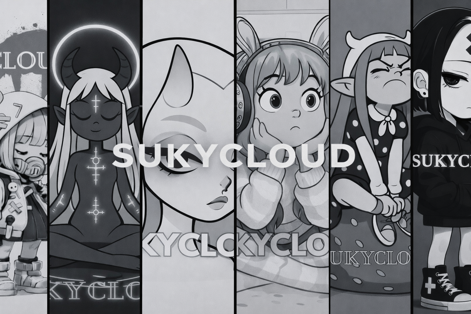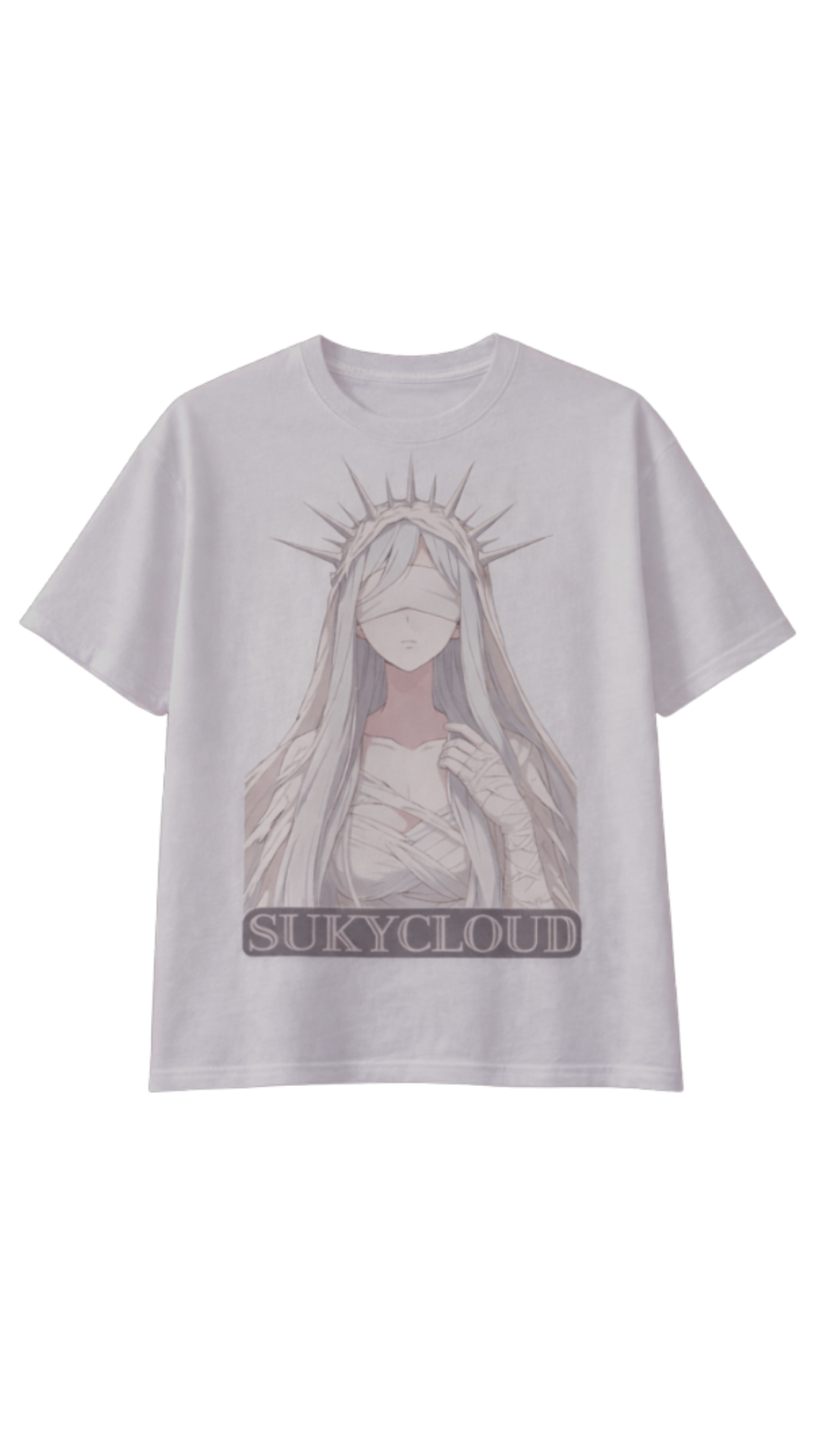 Playera de corte tradicional, cómoda y versátil para uso diario con estética urbana y reflexiva. En el frente tiene una ilustración femenina estilo manga, ojos cubiertos y corona de espinas, en tonos suaves y monocromáticos; transmite calma, introspección y fuerza silenciosa. El nombre SUKYCLOUD refuerza su aire espiritual.